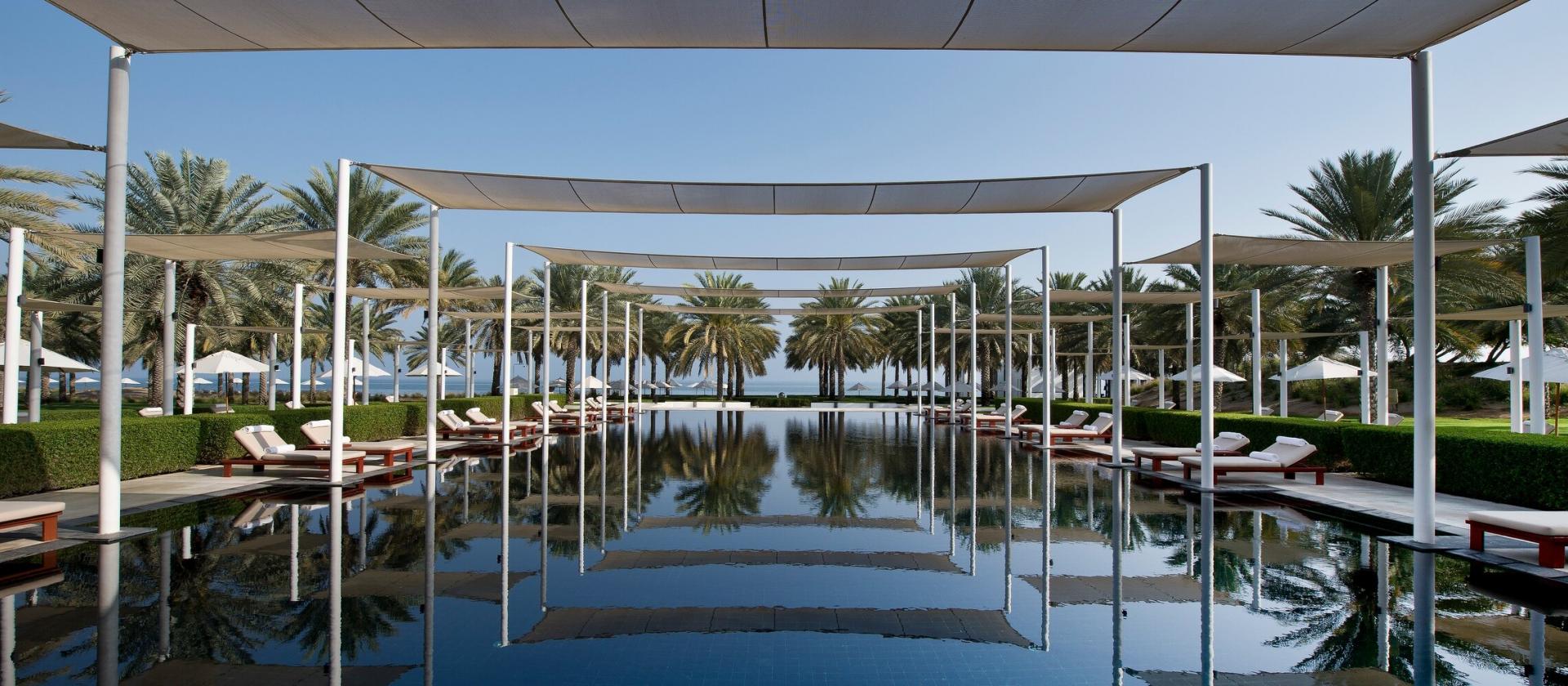 Serce resortu bije w trzech basenach – spokojnym Chedi Pool (tylko dla dorosłych), rodzinym Serai Pool oraz słynnym „Long Pool” o długości 103 metrów, najdłuższym na Bliskim Wschodzie, idealnym do porannego pływania. Na plaży goście odpoczywają w palmowych kabinach, korzystając z dyskretnej obsługi hotelowej.