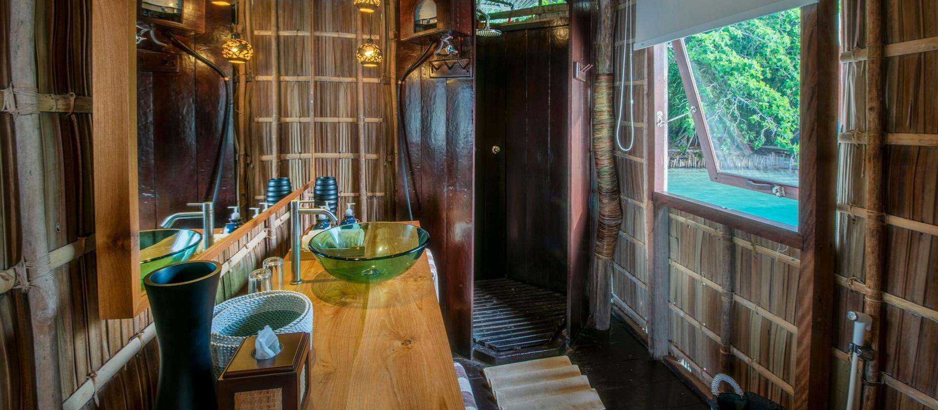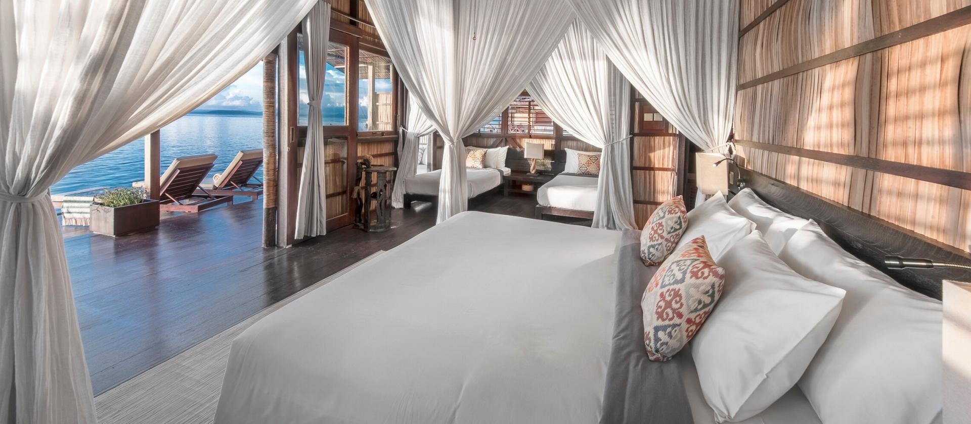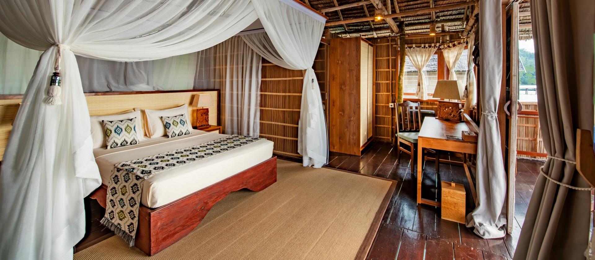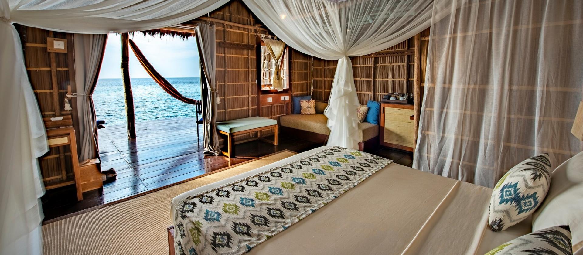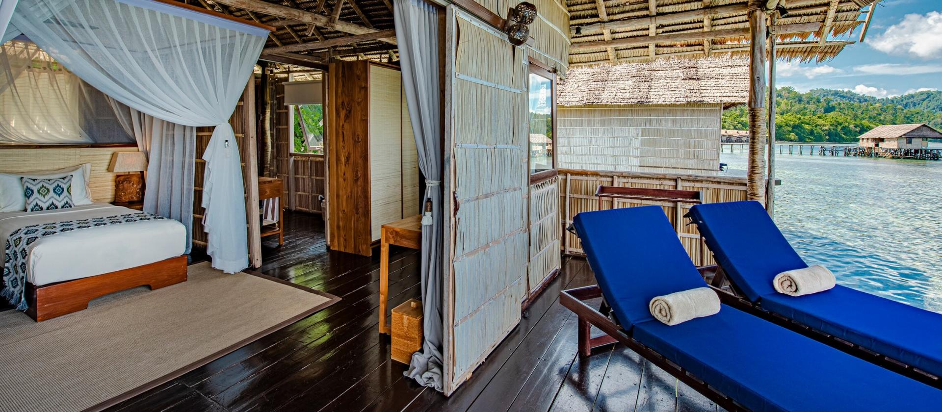70-metrowe bungalowy usytuowane bezpośrednio nad wodą. Te solidne, zbudowane tradycyjną techniką domki są przestronne i urokliwe, z naturalną wentylacją i cieniem z lokalnych, materiałów użytych do ich budowy. Każdy bungalow ma prywatną łazienkę oraz werandę, z której można podziwiać fantastyczny widok na morskie stworzenia i piękne zachody słońca wieczorami.