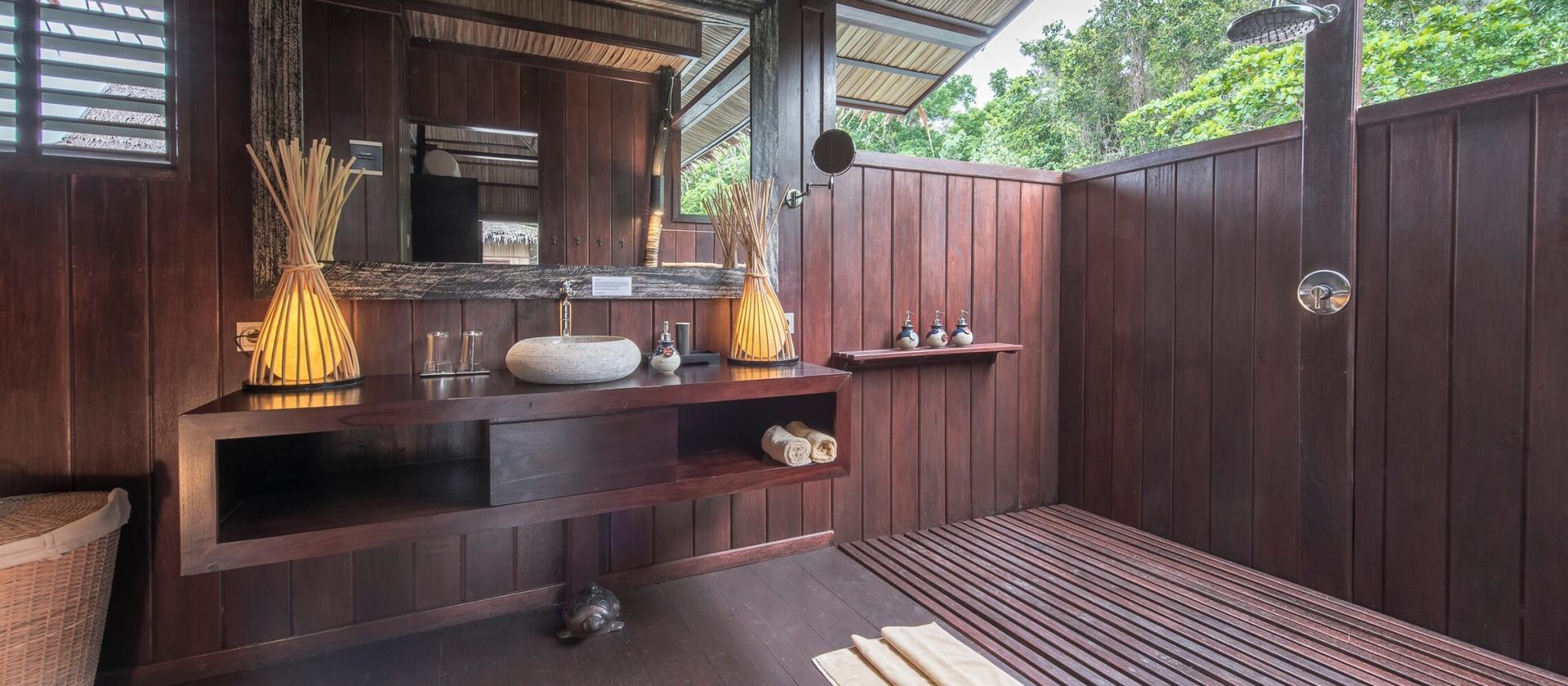 Każdy z trzech prywatnych gabinetów zabiegowych jest wyposażony w wanny, prysznice ze strumieniem deszczowym oraz zewnętrzne strefy do manicure / pedicure. Każdy z nich wychodzi na ocean, dzięki czemu można poczuć jedność z naturą. Każdy element spa, od akcentów tradycyjnego papuaskiego wystroju po spokojny salon, w którym można napić się świeżej herbaty imbirowej, zachęca ciało do uzdrowienia i odprężenia.