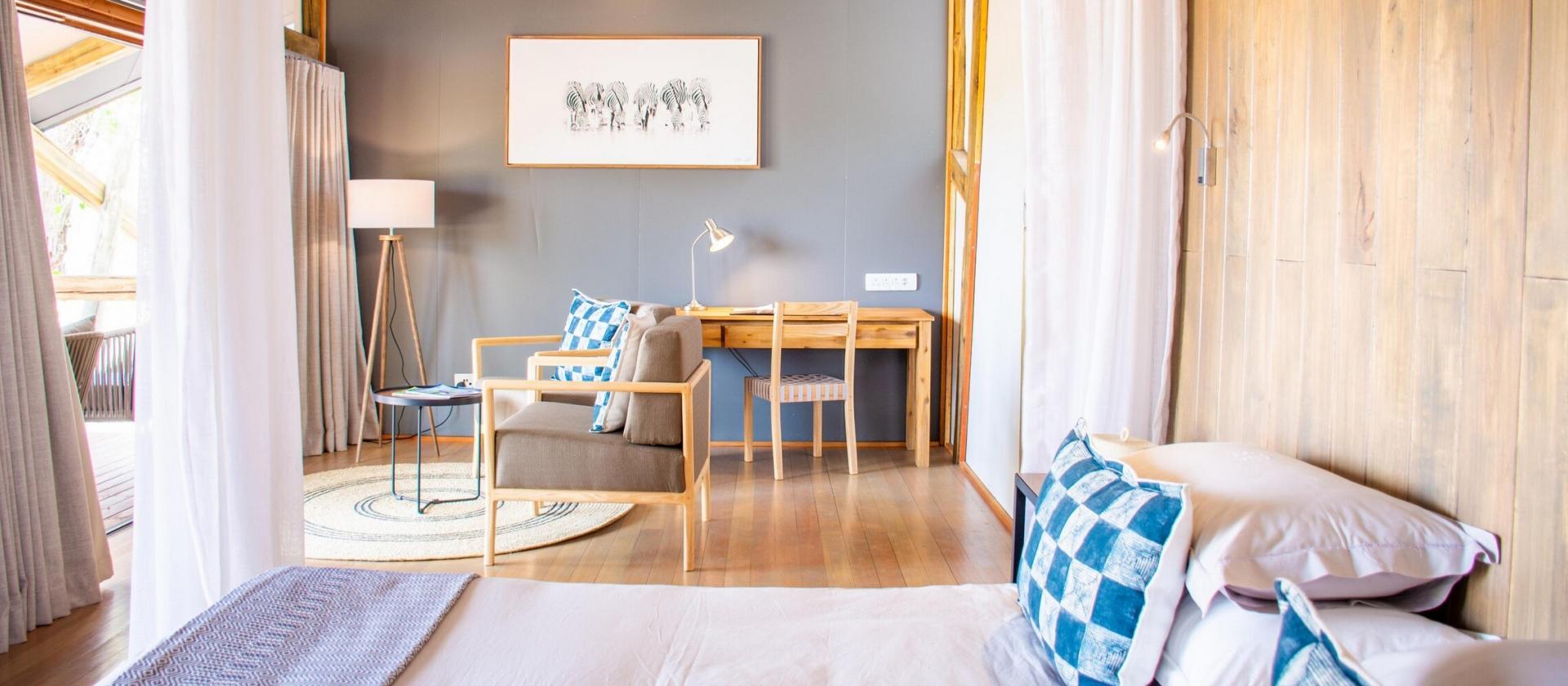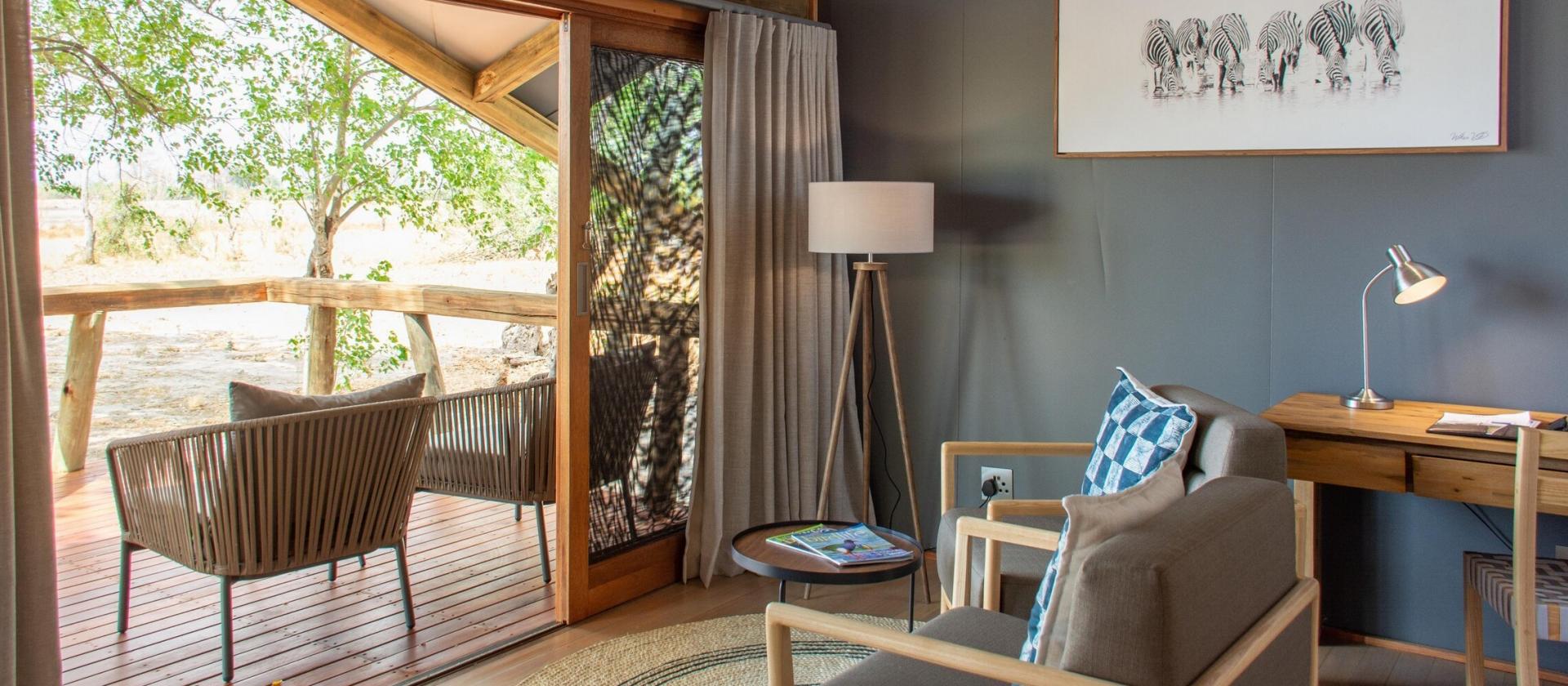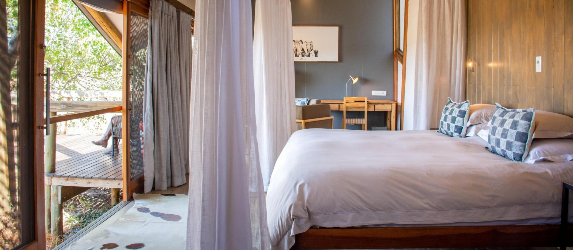 - Namioty wyposażone są w prywatne łazienki z prysznicami wewnętrznymi i zewnętrznymi oraz werandy z widokiem na wodopój, gdzie często pojawiają się dzikie zwierzęta
