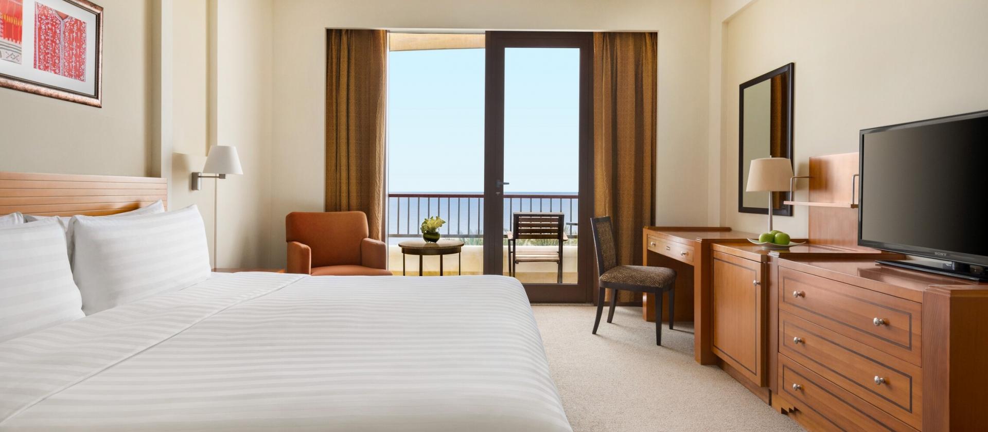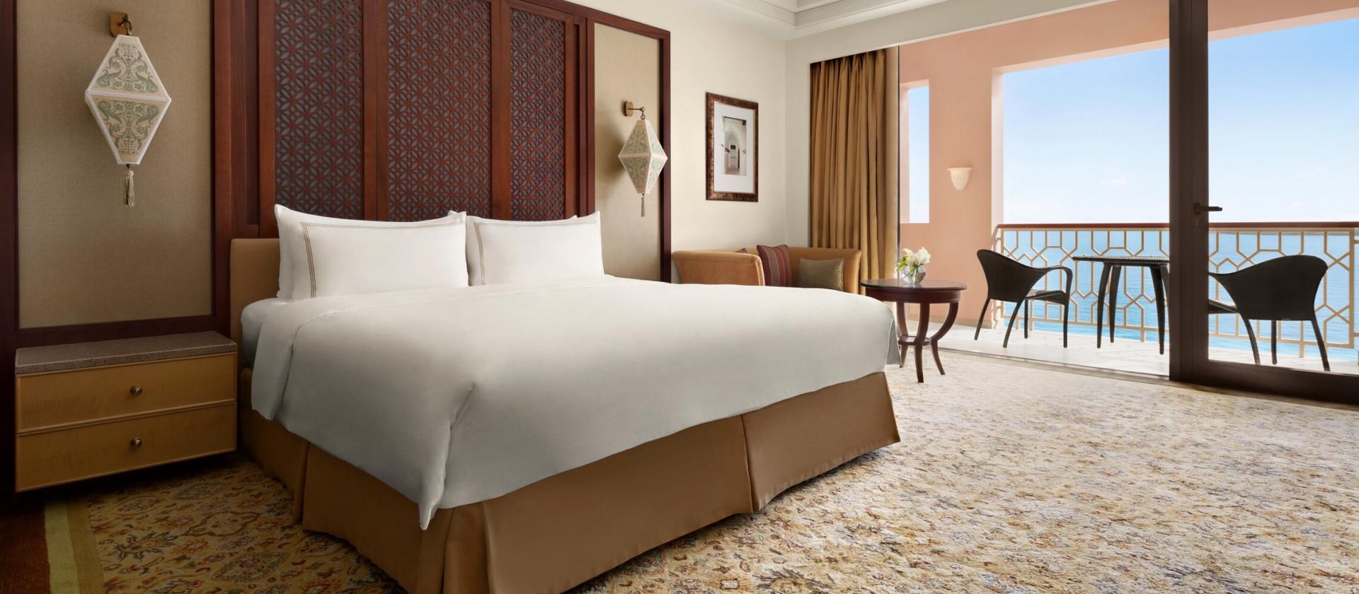 Al Husn Deluxe Sea View Room o powierzchni 48 mkw., maksymalnie 2 osoby. Pokój z obszernym balkonem i widokiem na zatokę – urlop w luksusowym wydaniu