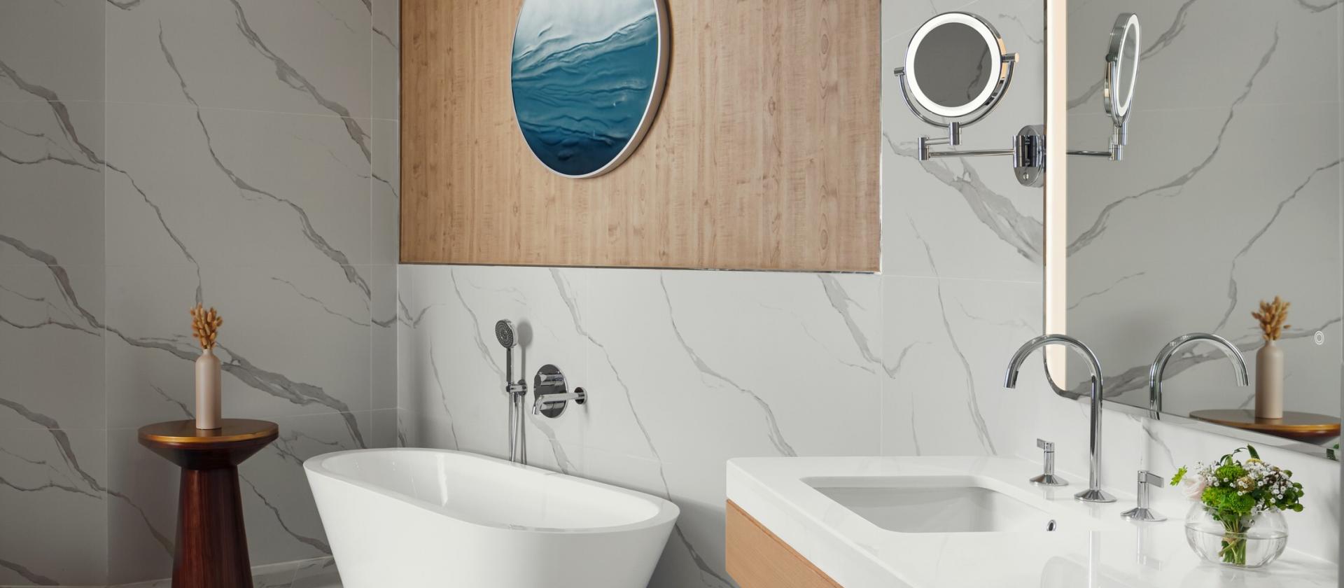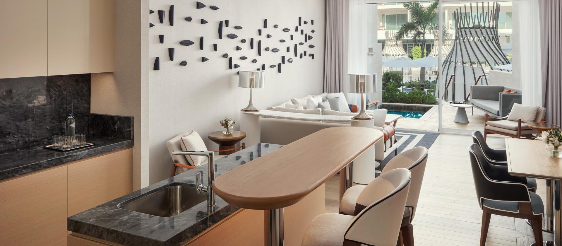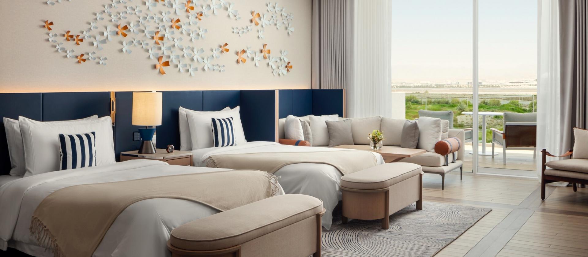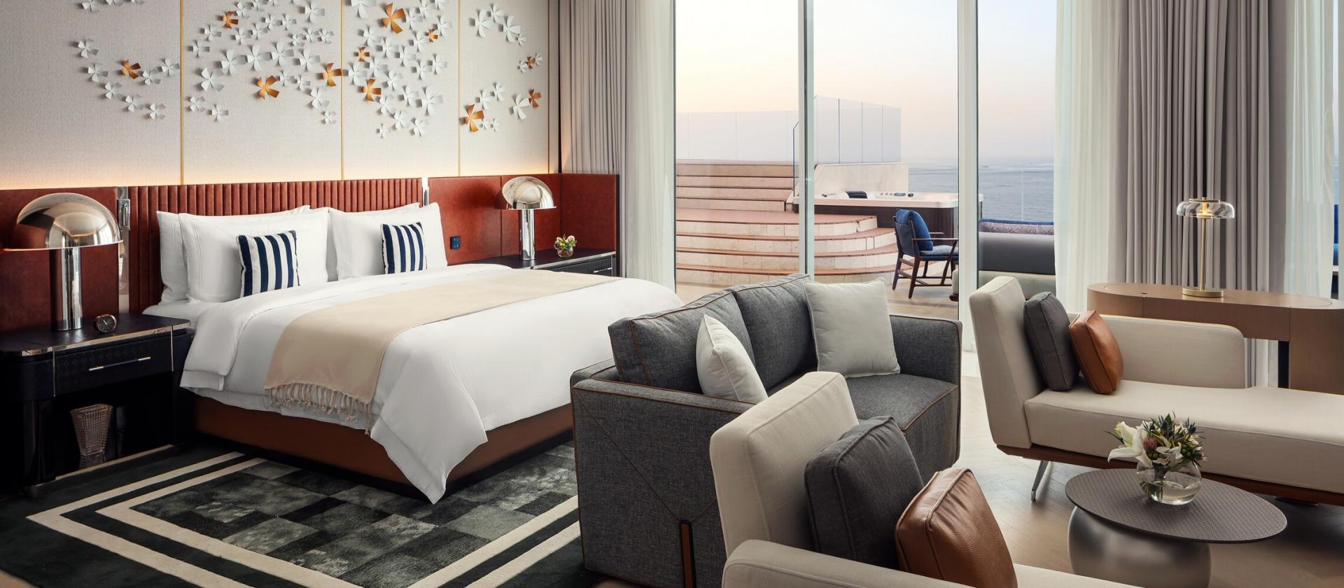 Wnętrza pokoi i suite’ów to symfonia światła – od 65 mkw. przestrzeni, balkony z widokiem na ocean, pole golfowe lub panoramę miasta. Przeszklenia od sufitu do podłogi sprawiają, że fala słońca i widok oceanu wlewają się do wnętrza, które zostało urządzone w stylu superjachtu: odcienie bieli, navy, drewno tan, skóra i lokalny kamień. Prywatne garderoby, marmurowe łazienki oraz delikatne turkusowe, koralowe dekoracje sprawiają, że każde wnętrze zachęca do zanurzenia się w komfort i relaks.