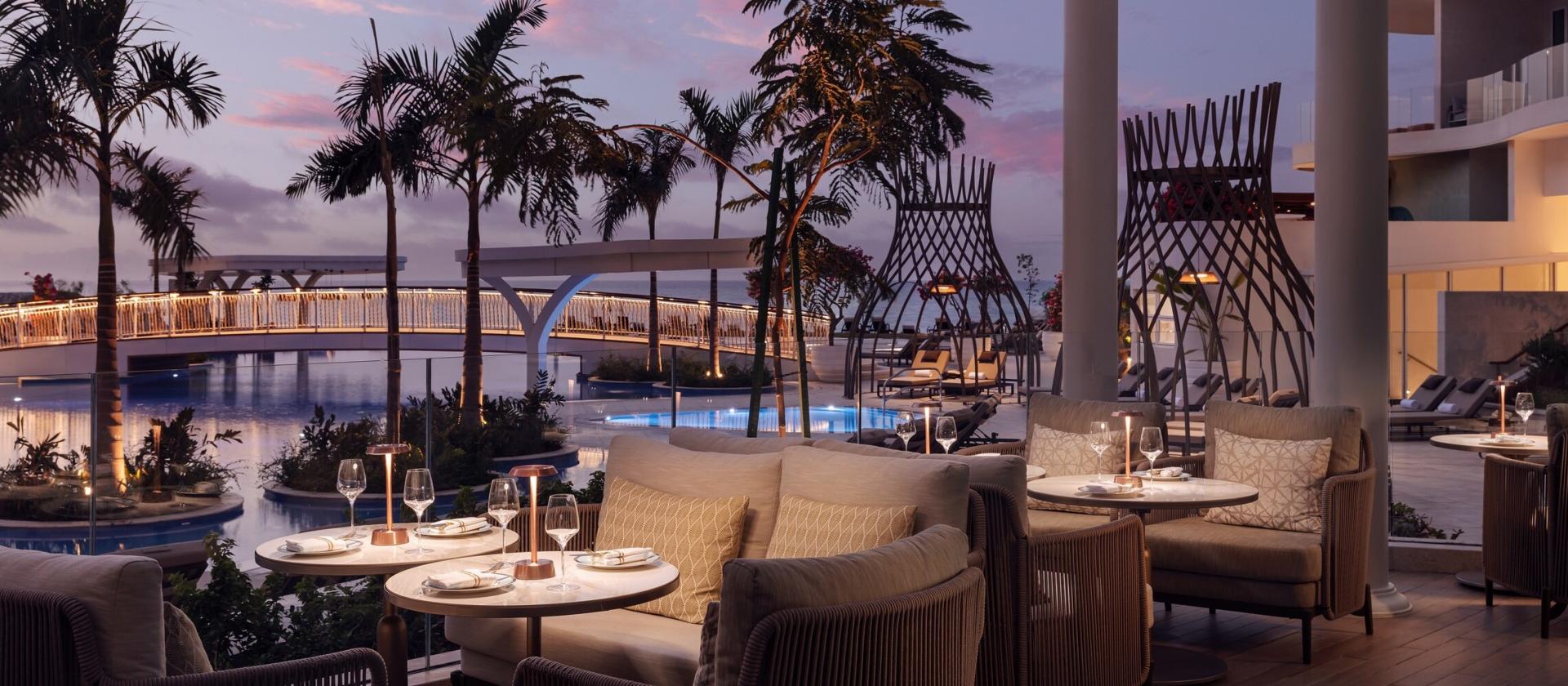 Odpoczynek pod palmami przy basenie – luźna atmosfera, bar wysokich stołków i widok na morze. Świetne miejsce na odświeżające koktajle w ciągu dnia.