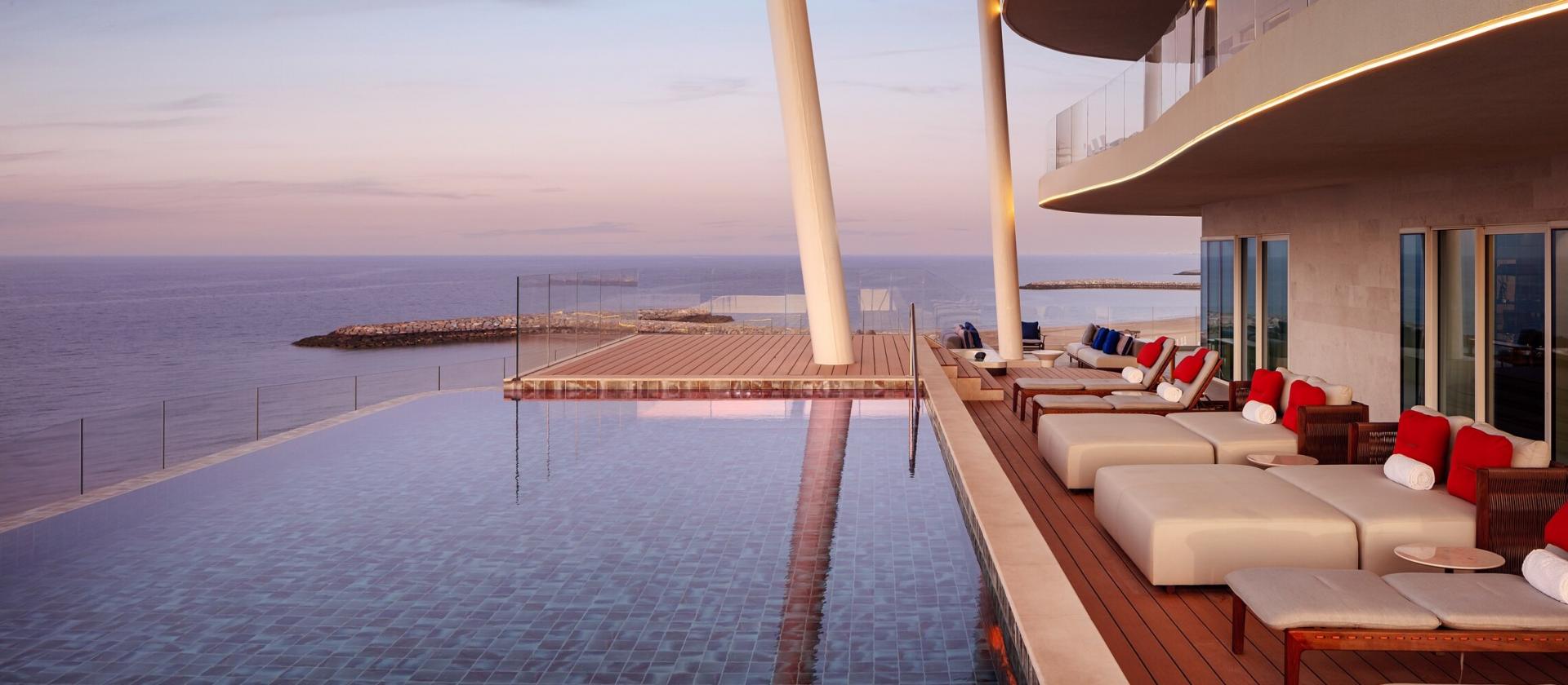 Jego architektura inspirowana jest krzywiznami oceanu i luksusem jachtów – budynek owija się wokół centralnego basenu niczym fala, z białym kamieniem, stonowaną paletą navy i koralowych akcentów, które nawiązują do kolorów morza i piasku. W lobby uwagę przykuwa organiczna klatka schodowa, żyrandole jak z żagla łodzi, rzeźby i lokalne dzieła sztuki – malarstwo, rzeźby, kaligrafie międzynarodowych artystów.