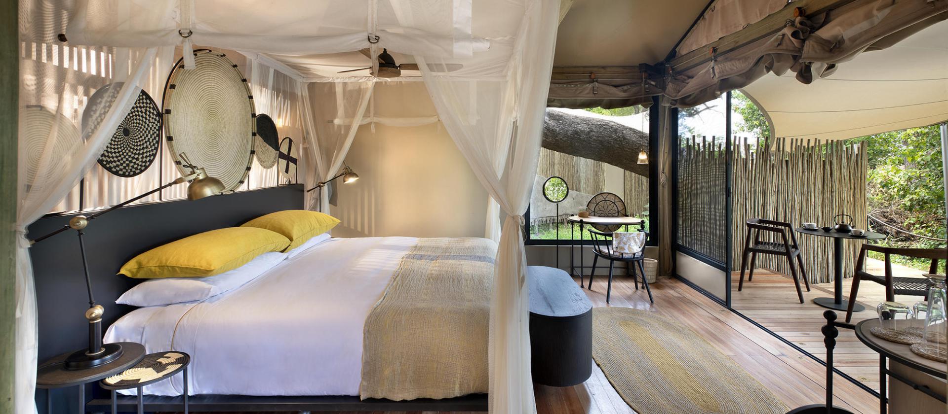 6 luksusowych namiotów – każdy z łóżkiem king-size, moskitierą, wewnętrznym i zewnętrznym prysznicem, minibarem, tarasem, designem inspirowanym lokalnym rękodziełem