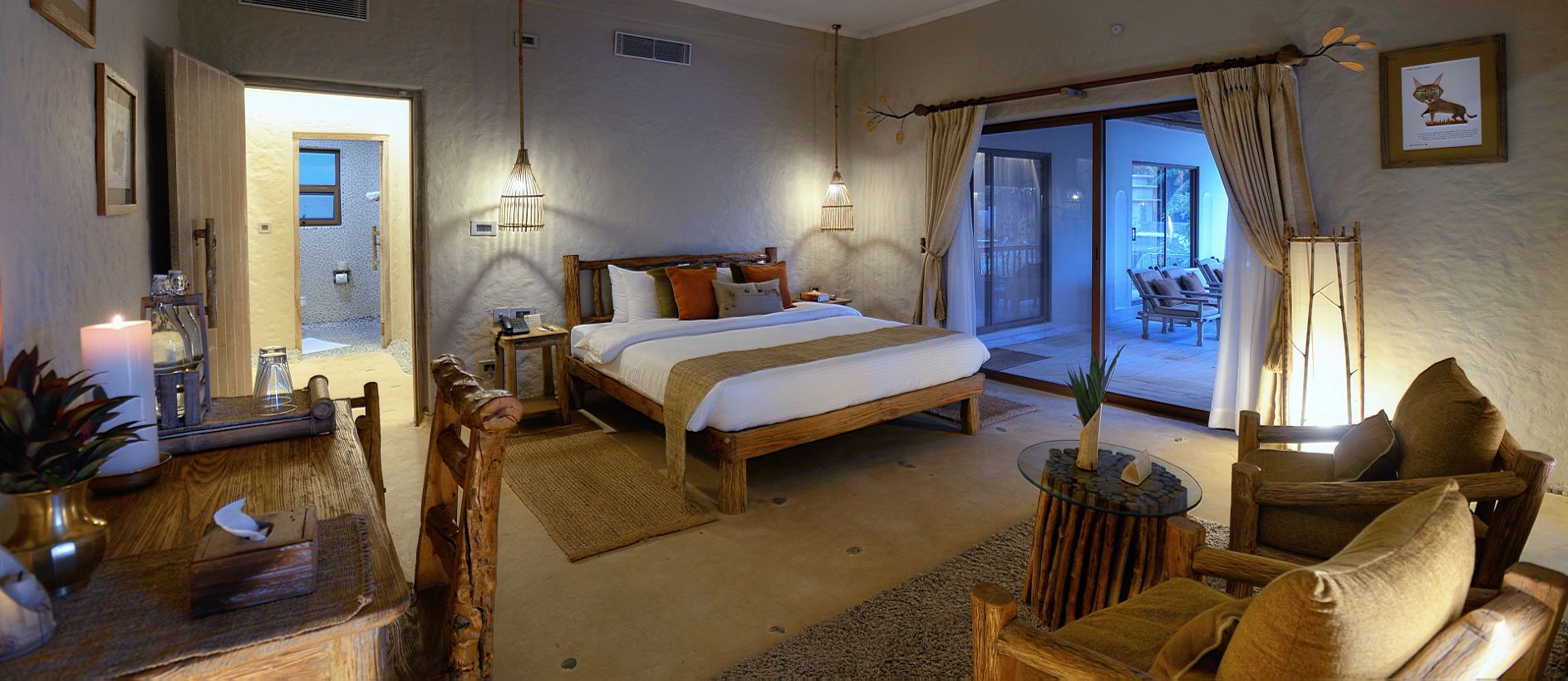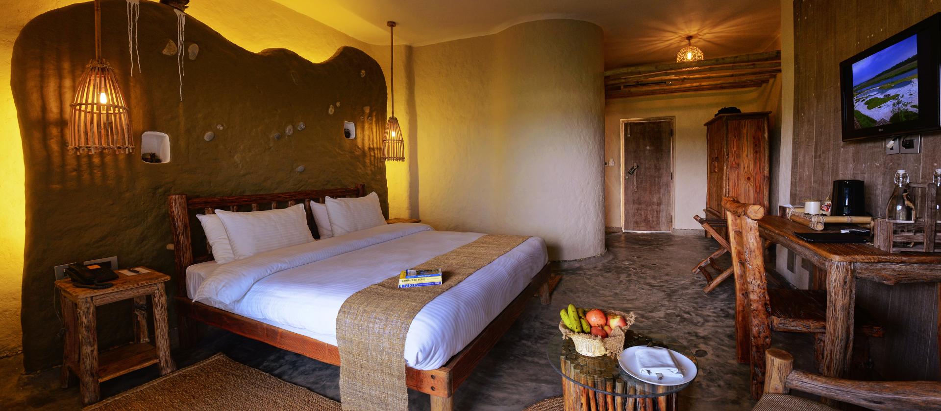 - Domki inspirowane kulturą Tharu, wykonane z lokalnych materiałów, uzupełnione starannie dobranymi elementami dekoracyjnymi