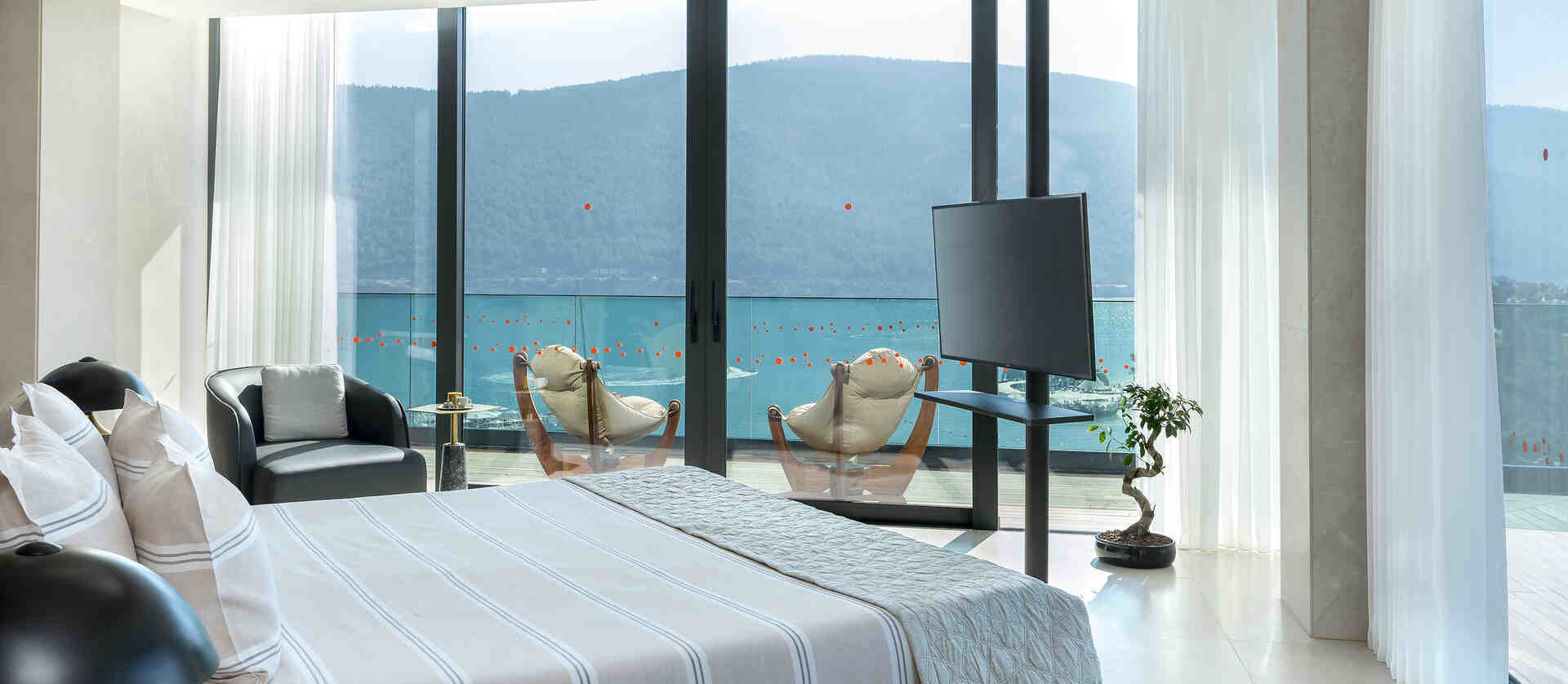 Superior Room to przestrzeń o powierzchni 45 mkw. dla maksymalnie 3 osób (dorośli + dzieci do 11,99 lat). Z okien roztacza się widok na Zatokę Egejską, a w środku znajdziecie sofę przygotowaną jako dodatkowe miejsce do spania dla dziecka, elegancką łazienkę z prysznicem, balkon oraz luksusowe umeblowanie