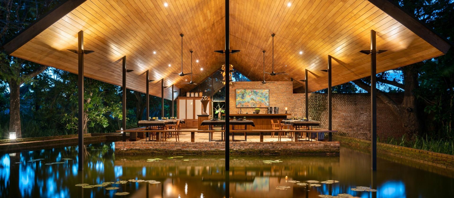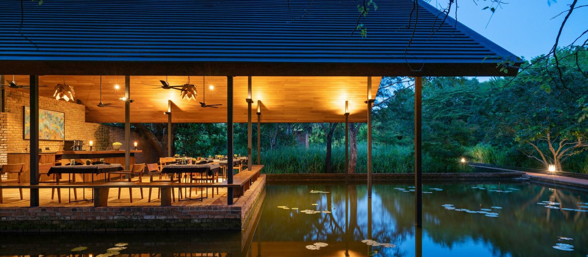 Kuchnia łącząca lokalne smaki Sri Lanki z wpływami międzynarodowymi, serwowanie posiłków w otoczeniu wody i ogrodów, atmosfera sprzyjająca relaksowi przy jedzeniu.