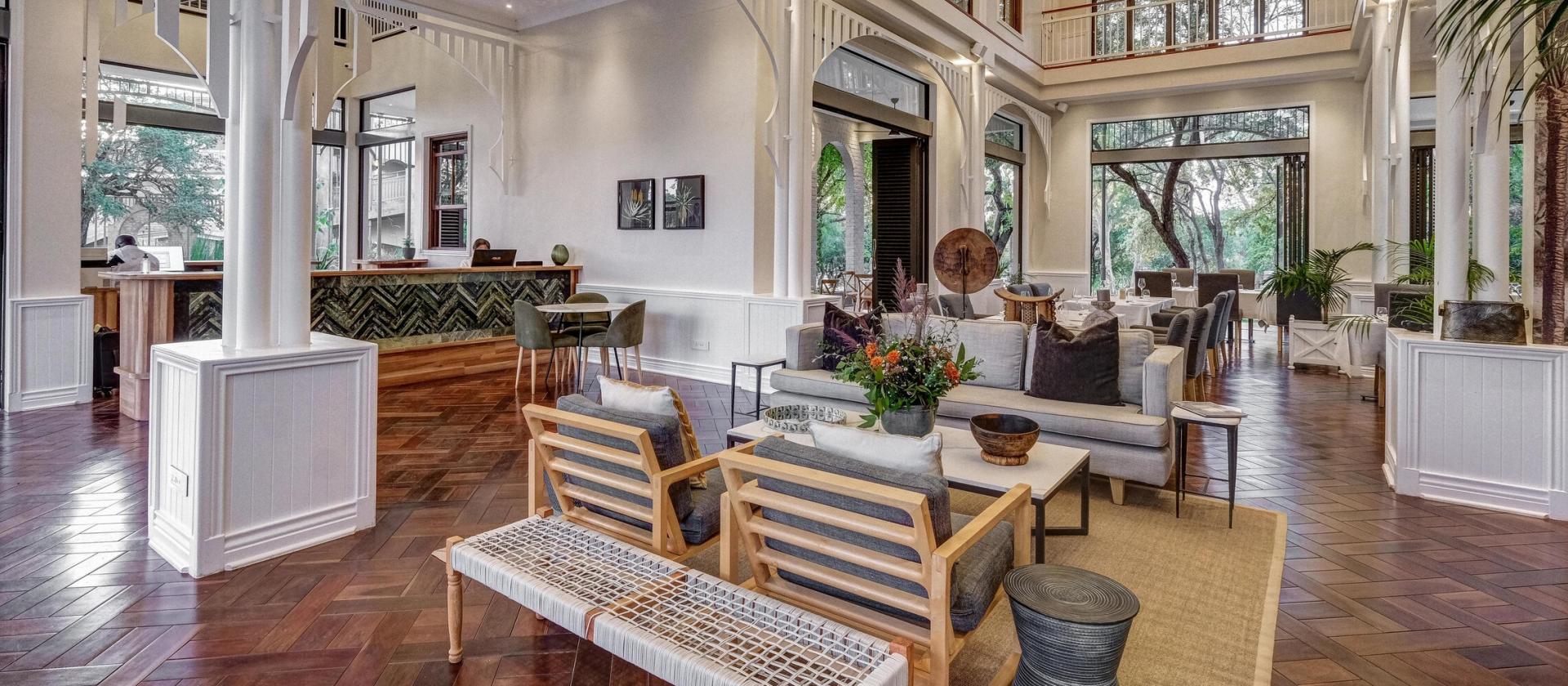 Styl hotelu czerpie inspiracje z lokalnych warunków afrykańskich — wysokie sufity, dużo przestrzeni, okna panoramiczne, naturalne materiały i harmonia z krajobrazem.