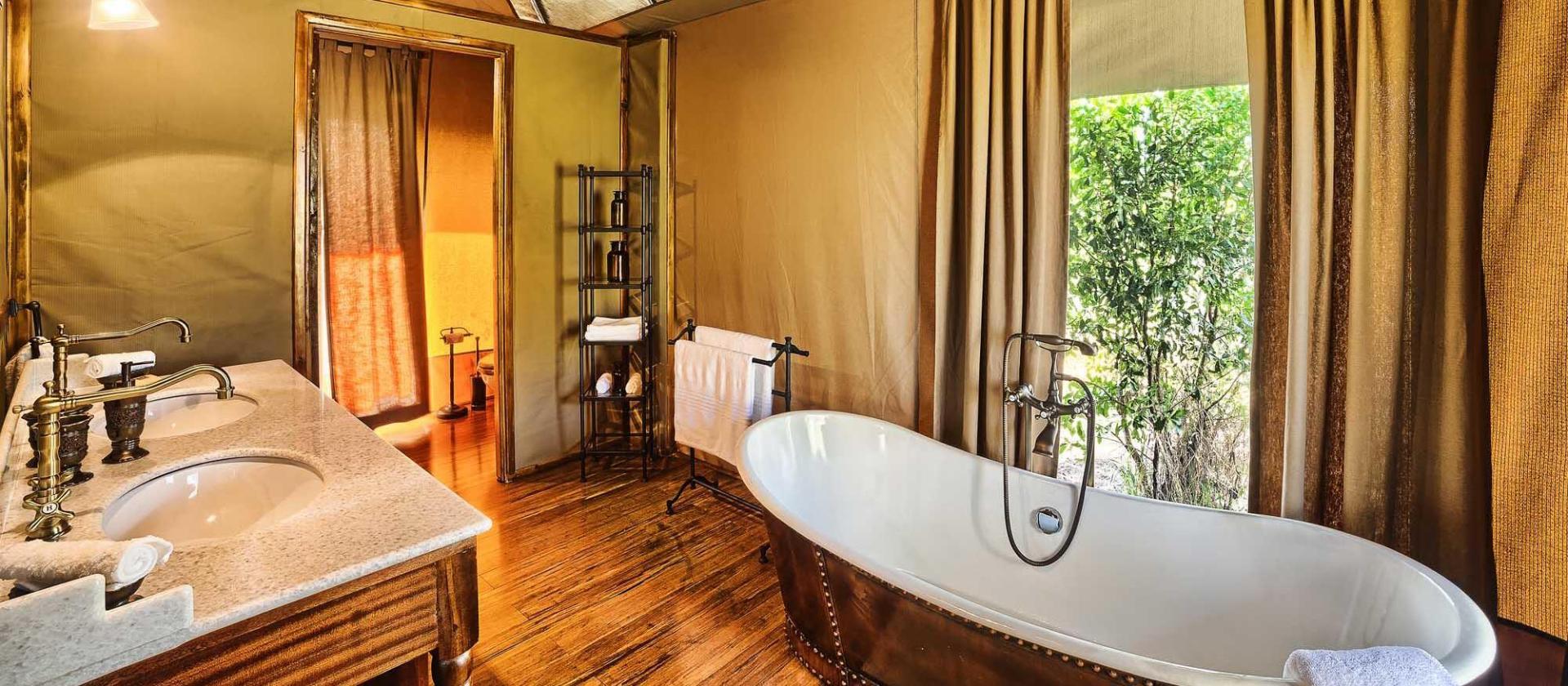 W każdym z 15 luksusowych namiotów safari poczujecie się jak w epoce klasycznych afrykańskich wypraw, ale z pełnym komfortem współczesnego luksusu. Namioty mają około 49 mkw. i stoją na podwyższonych, drewnianych platformach, co zapewnia poczucie prywatności i kontaktu z naturą. Wnętrze stylizowane jest z myślą o estetyce safari z lat 20. i 30. – z elementami drewna, stonowanymi barwami ziemi oraz eleganckimi detalami, które przywołują klimat przygody i kolonialnej elegancji. Każdy namiot posiada prywatną łazienkę en suite z przestronnym prysznicem (wewnętrznym i często możliwością kąpieli na zewnątrz), umywalkami i wygodnymi udogodnieniami. Duże łóżko (king lub konfiguracja twin) gwarantuje komfortowy sen po dniu pełnym safari. Do namiotu przylega drewniany taras z miejscem do siedzenia, na którym możecie odpocząć z widokiem na rzekę i sawannę, obserwując dzikie zwierzęta w ich naturalnym środowisku.