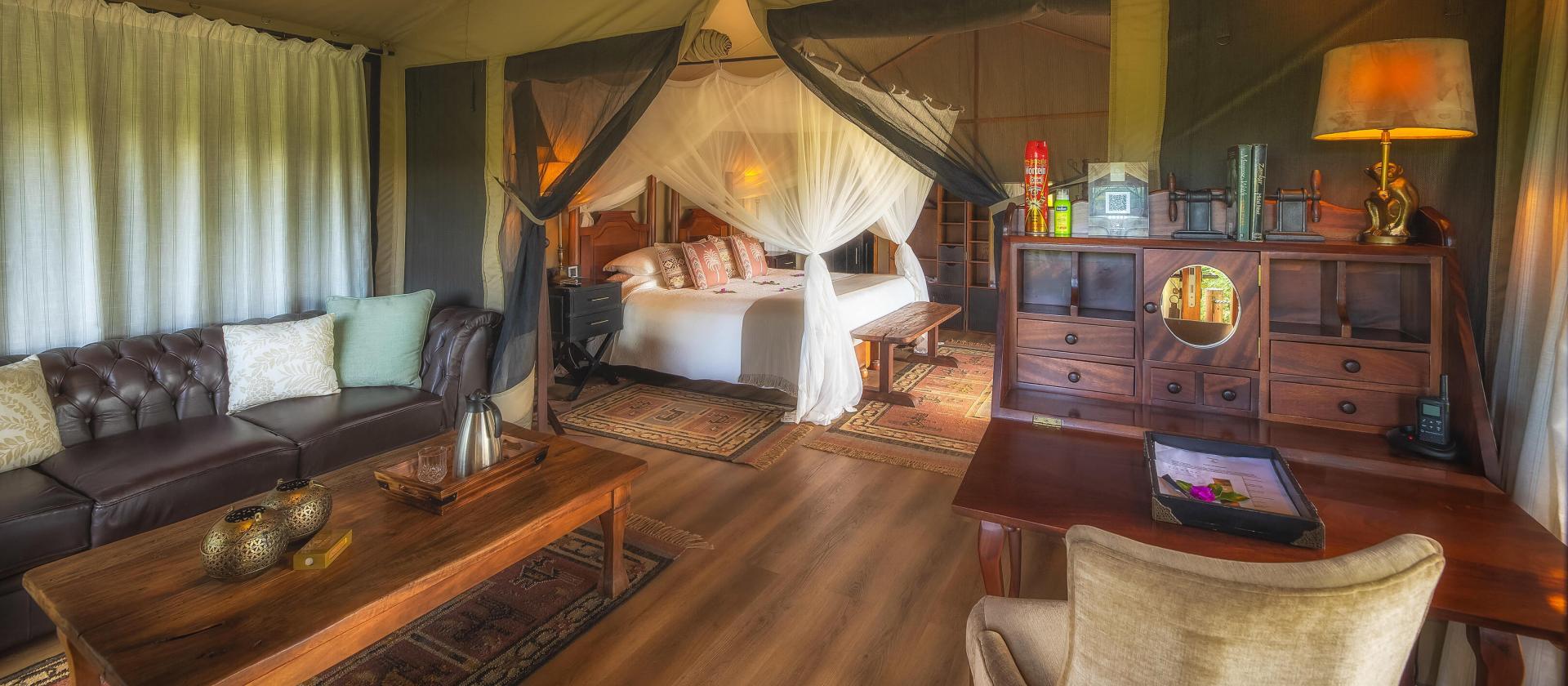 Wnętrza wszystkich namiotów łączą komfort luksusowego lodge’u z autentycznym klimatem safari z lat 20. i 30., co odzwierciedlają zarówno meble, jak i dodatki. Elewana wykorzystuje naturalne materiały, ziemiste barwy i klasyczne elementy wyposażenia, które tworzą atmosferę elegancji i przygody jednocześnie. Przestronne łóżka, wygodne miejsca do siedzenia oraz starannie zaplanowane detale sprawiają, że nawet chwile spędzone „w domu” są równie wyjątkowe jak safari prowadzone przez przewodników.