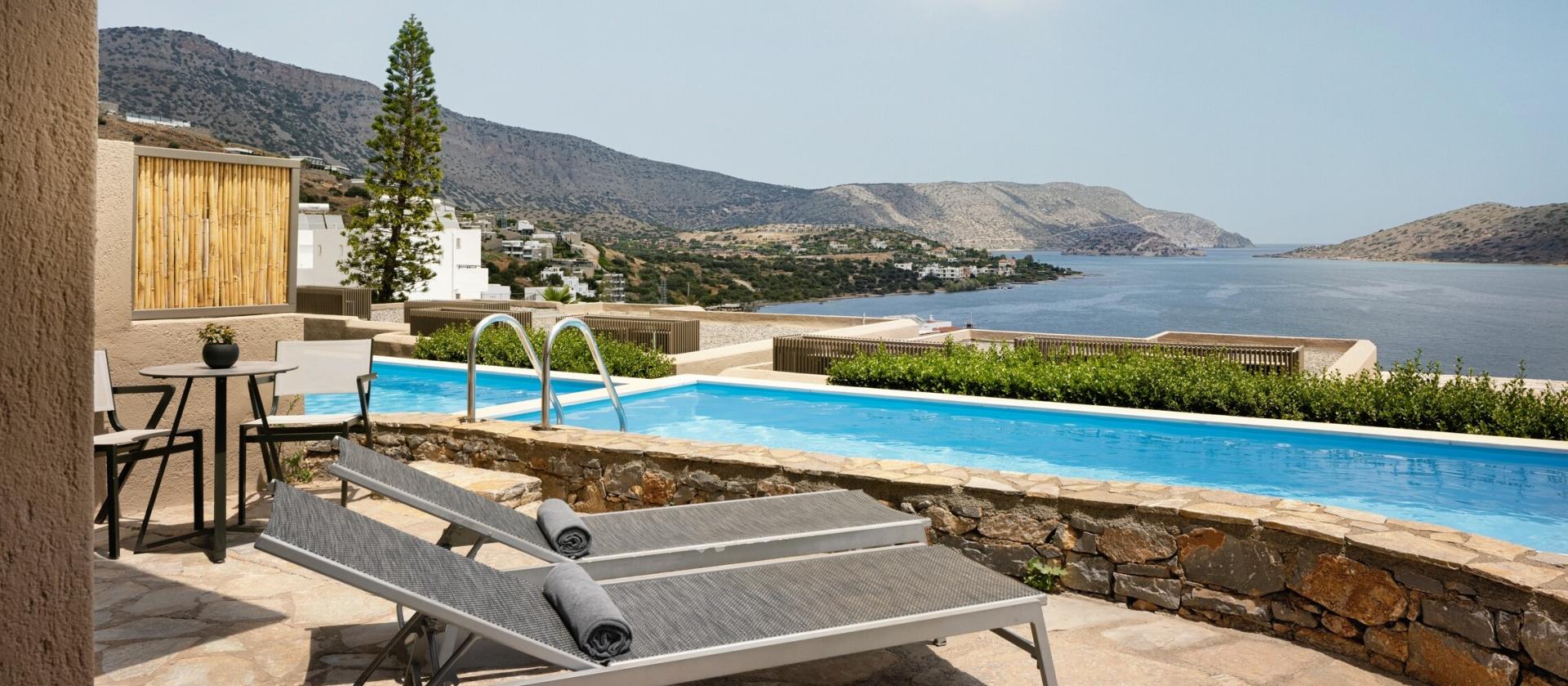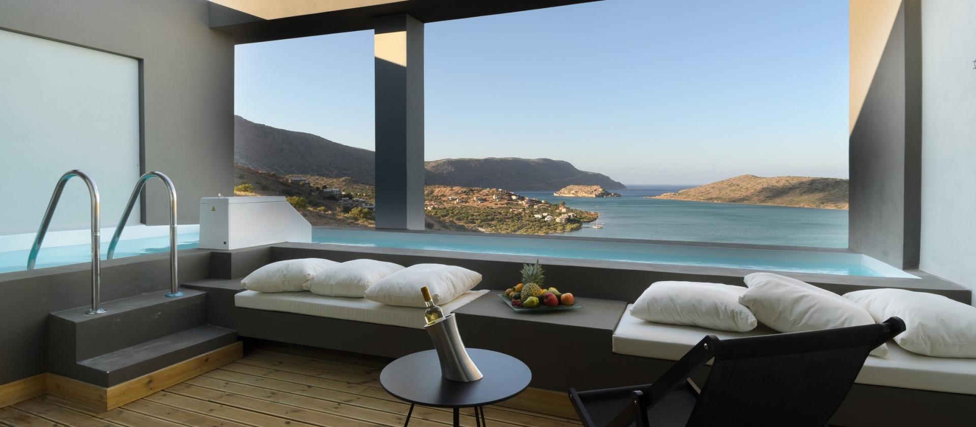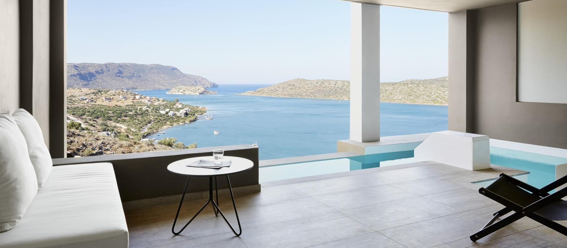 Sapphire Cozy Suite with individual pool (37-46 mkw.) – Bardzo przestronny apartament z prywatnym basenem i umeblowanym drewnianym tarasem. Minimalistyczny wystrój w odcieniach błękitu, szarości i beżu zapewnia spokojny pobyt z widokiem na wyspę Spinalonga z „pierwszego rzędu”. Wyżywienie: Ultra All-Inclusive.