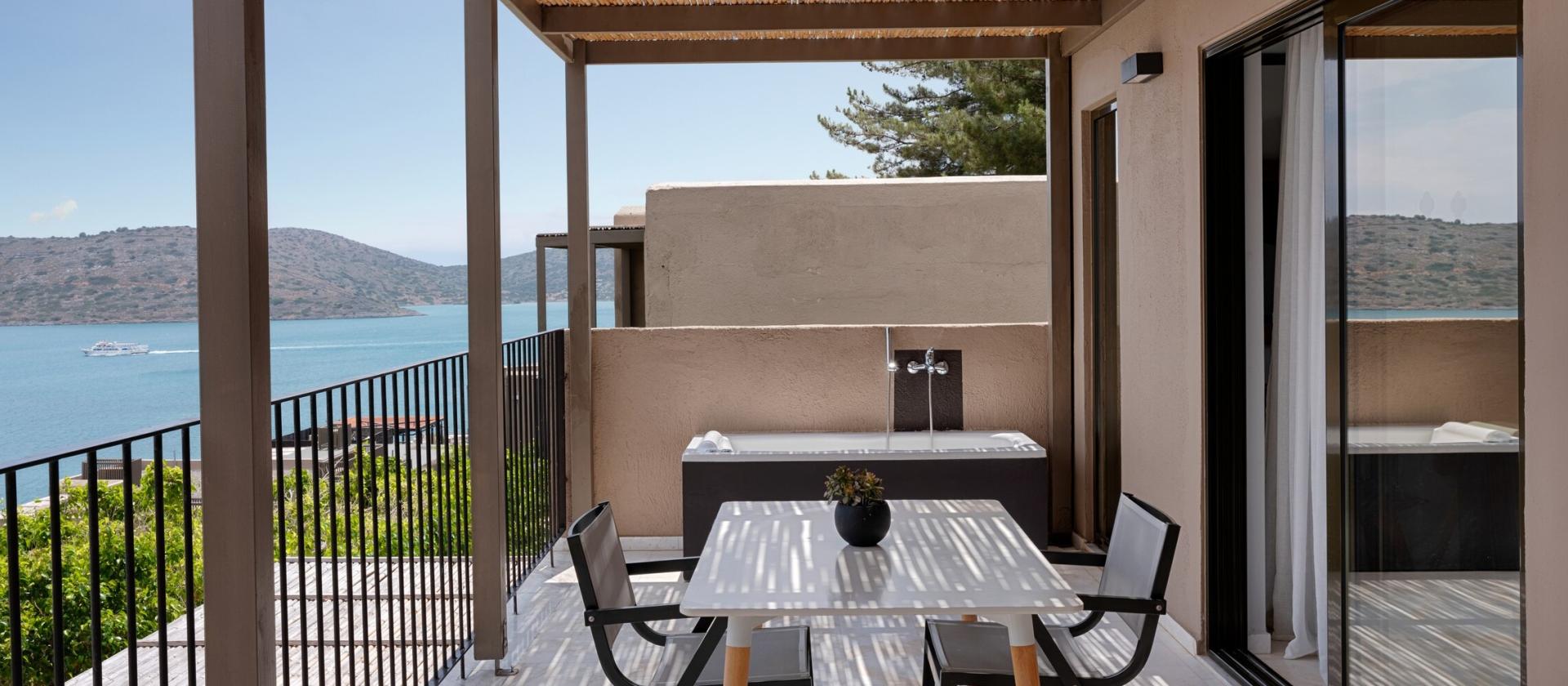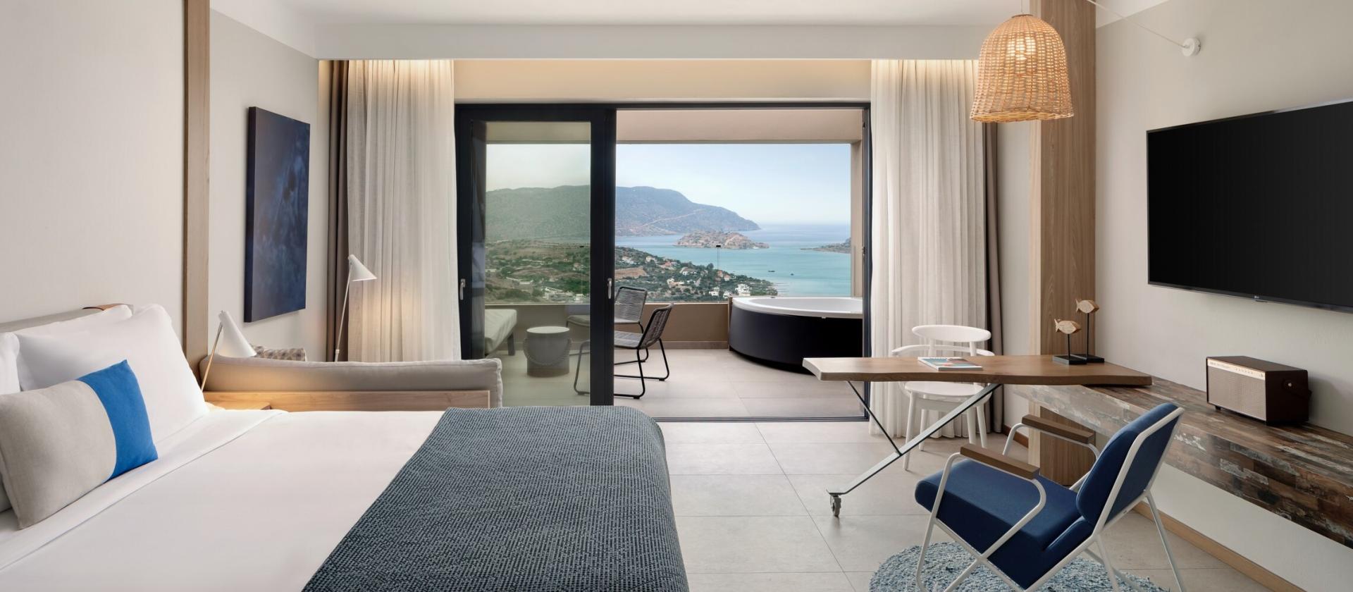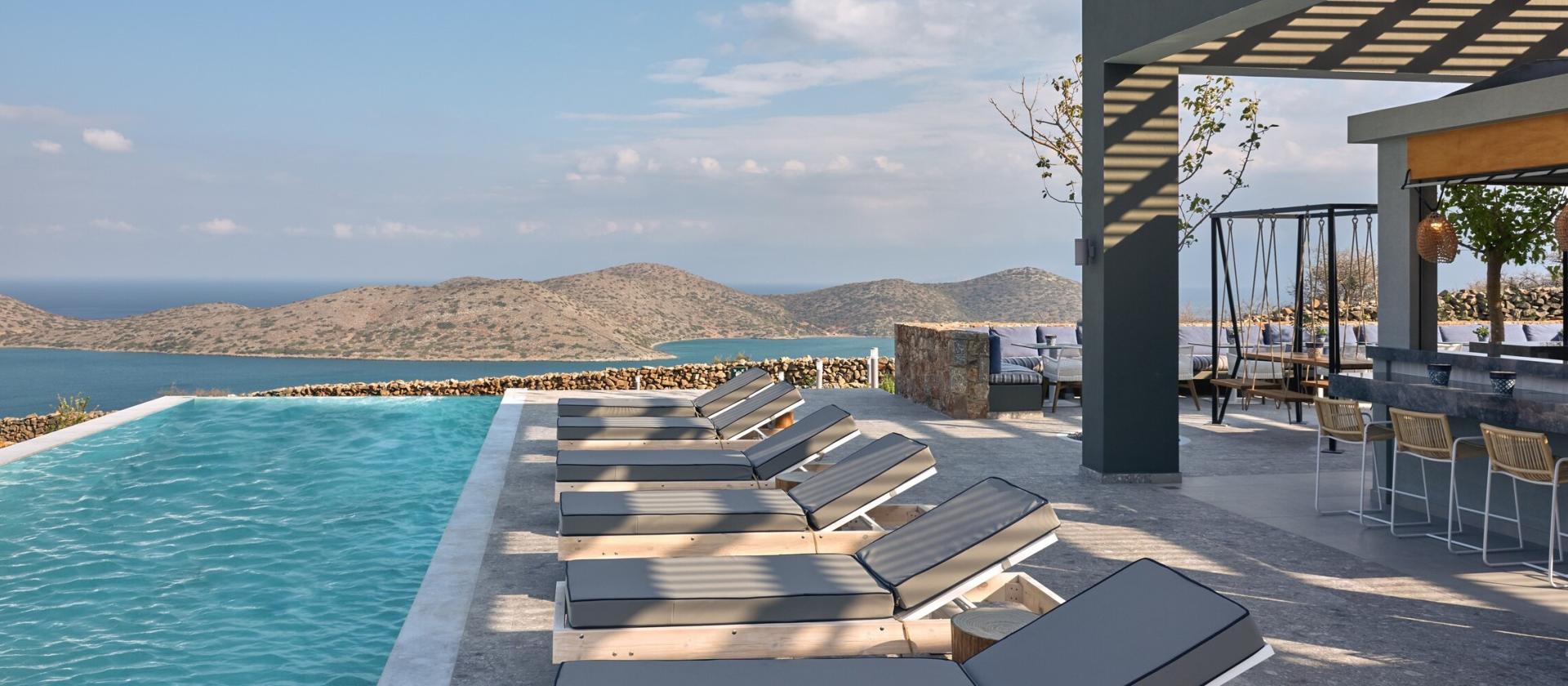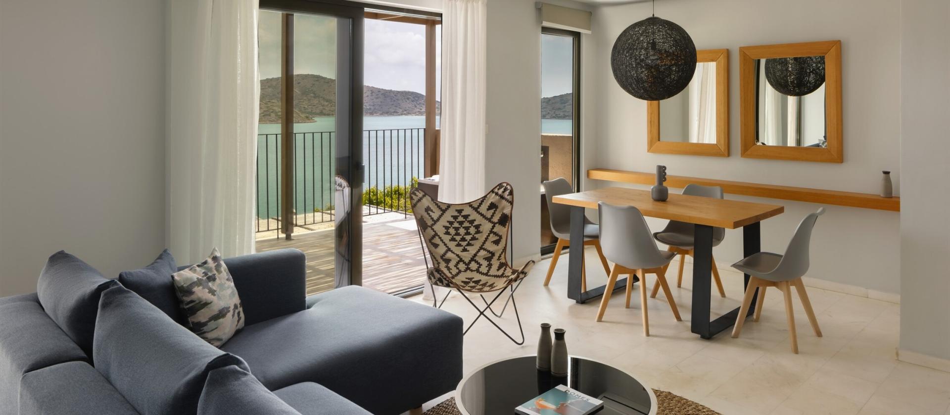 Sapphire Cozy Suite with individual pool (37-46 mkw.) – Bardzo przestronny apartament z prywatnym basenem i umeblowanym drewnianym tarasem. Minimalistyczny wystrój w odcieniach błękitu, szarości i beżu zapewnia spokojny pobyt z widokiem na wyspę Spinalonga z „pierwszego rzędu”. Wyżywienie: Ultra All-Inclusive.