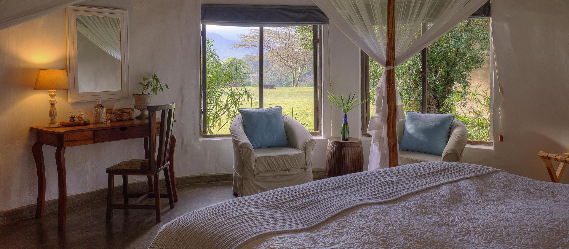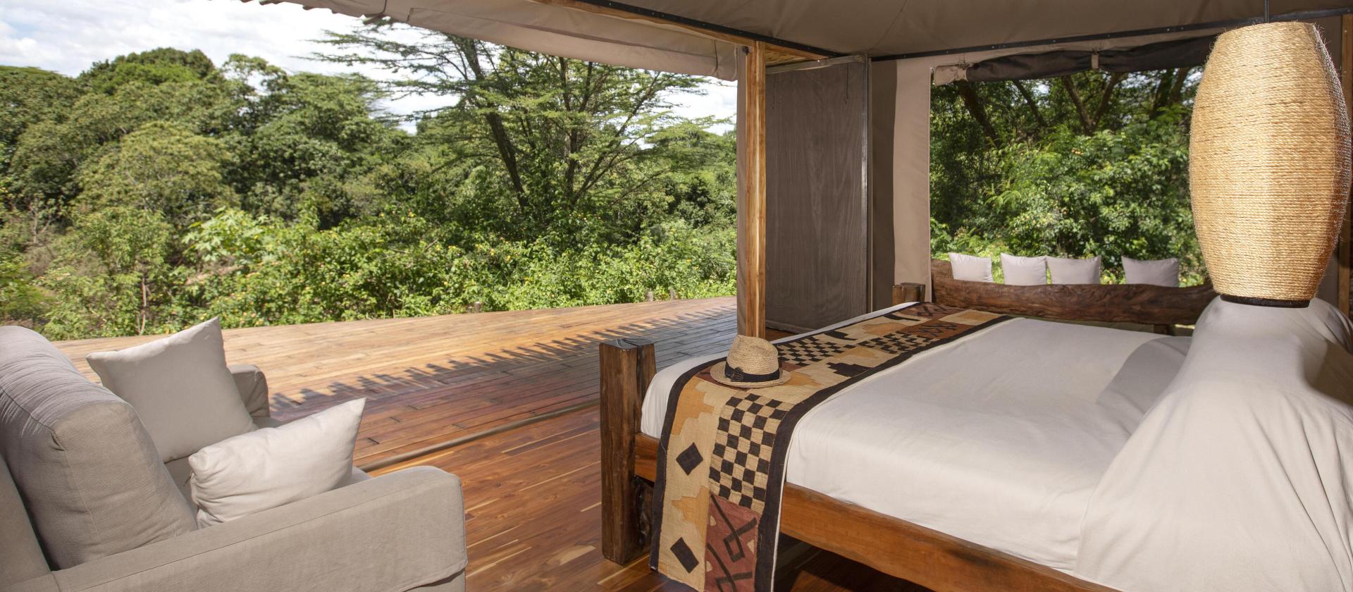 W sercu lodge’u znajduje się przestronna jadalnia i salon z barem w stylu suahili, gdzie wieczory spędza się przy trzaskającym ogniu w kominku. Na zewnątrz rozciągają się wypielęgnowane trawniki, idealne do gry w badmintona czy krokieta, prowadzące aż do rzeki, w której często można dostrzec pluskające się hipopotamy. To miejsce, gdzie czas zwalnia – możecie odpocząć na leżaku przy basenie, wziąć udział w lekcji jogi na świeżym powietrzu lub udać się na farmę, by spróbować swoich sił w dojeniu krów.