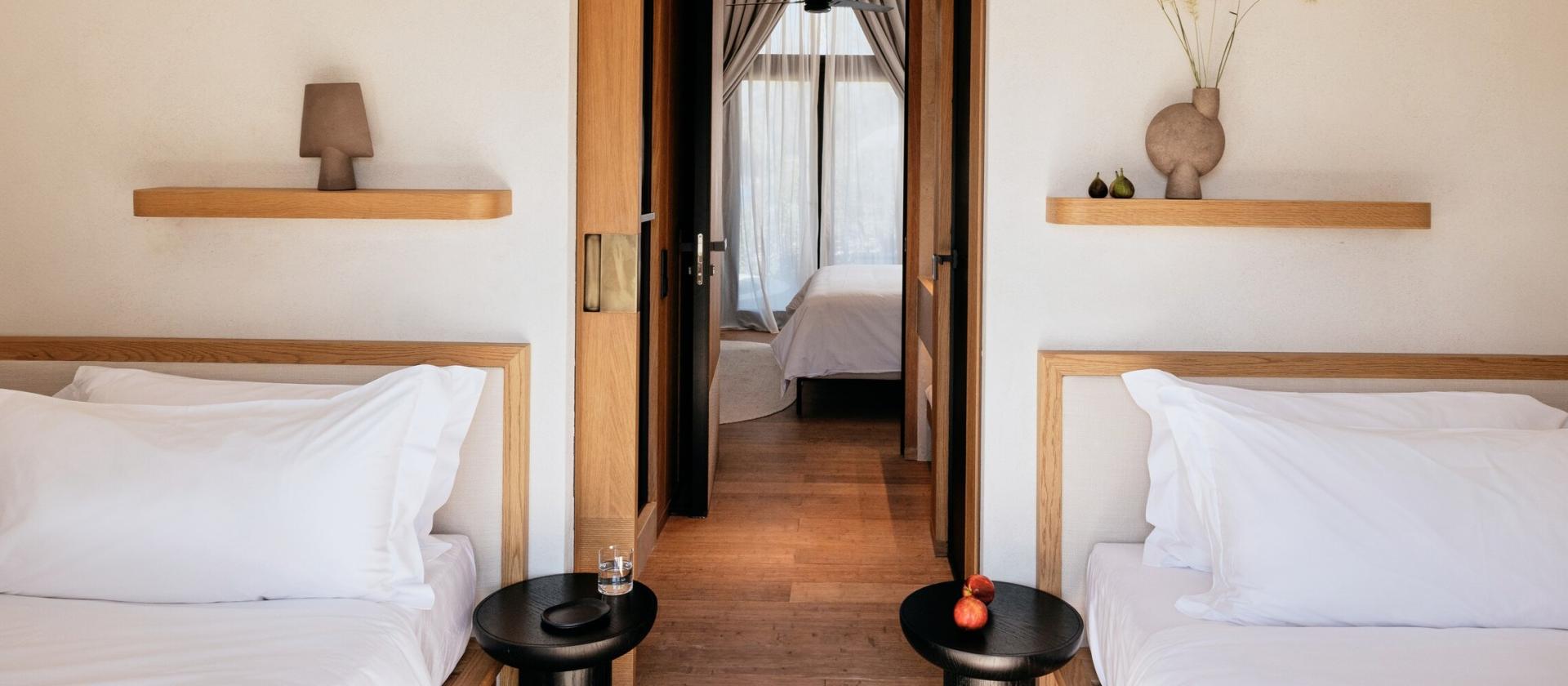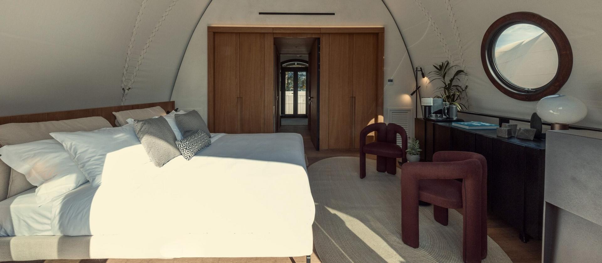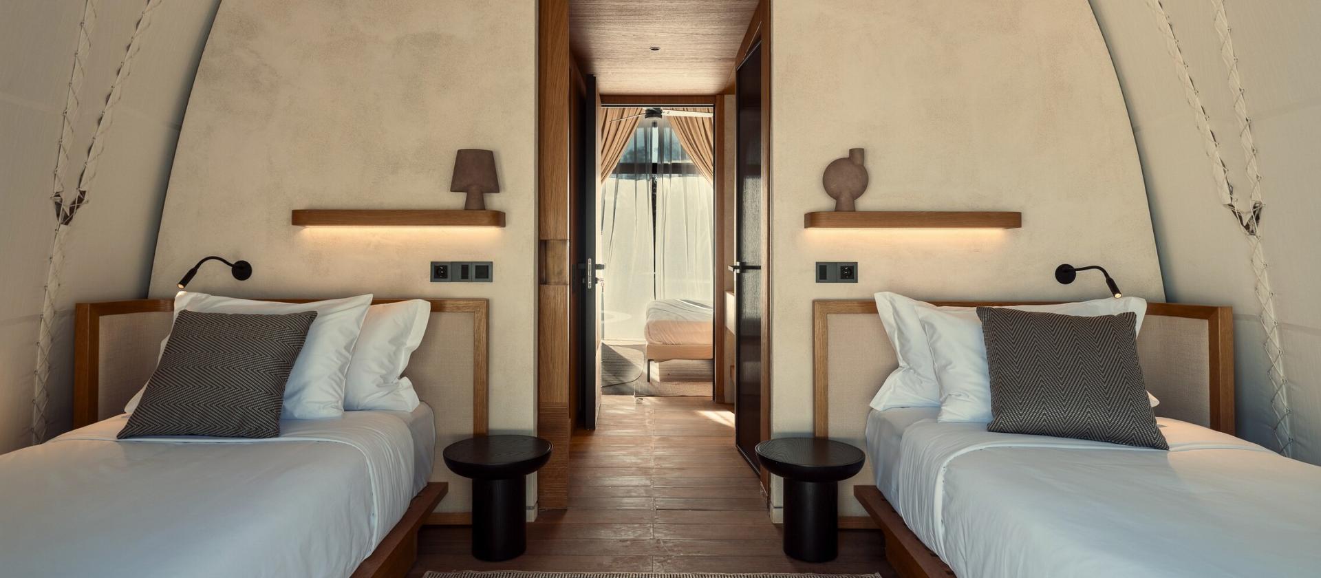 W 91 Athens Riviera każda kabana jest arcydziełem nowoczesnego glampingu, oferującym przestrzeń około 43 mkw. czystego luksusu. Wchodząc do środka, od razu poczujecie przestronność dzięki wysokim sufitom i strategicznie rozmieszczonym przeszkleniom, które wpuszczają do wnętrza miękkie, śródziemnomorskie światło. Wnętrza zostały wykończone w ciepłych barwach piasku i drewna, z dbałością o każdy detal – od wysokiej jakości pościeli po designerskie meble. Każda kabana posiada własny taras, na którym możecie odpoczywać w otoczeniu prywatnego ogrodu, ciesząc się absolutnym spokojem. Wyposażenie obejmuje klimatyzację, luksusową łazienkę z prysznicem typu walk-in oraz zaawansowane systemy nagłośnienia, co sprawia, że Wasz namiot staje się inteligentnym i przytulnym domem na czas wakacji. Niektóre jednostki oferują dodatkowe udogodnienia, takie jak prywatne wanny z hydromasażem na zewnątrz, co czyni pobyt jeszcze bardziej wyjątkowym. To zakwaterowanie stworzone dla tych, którzy chcą zasypiać słysząc szum drzew, nie rezygnując z komfortu, jaki oferują najlepsze apartamenty hotelowe.
