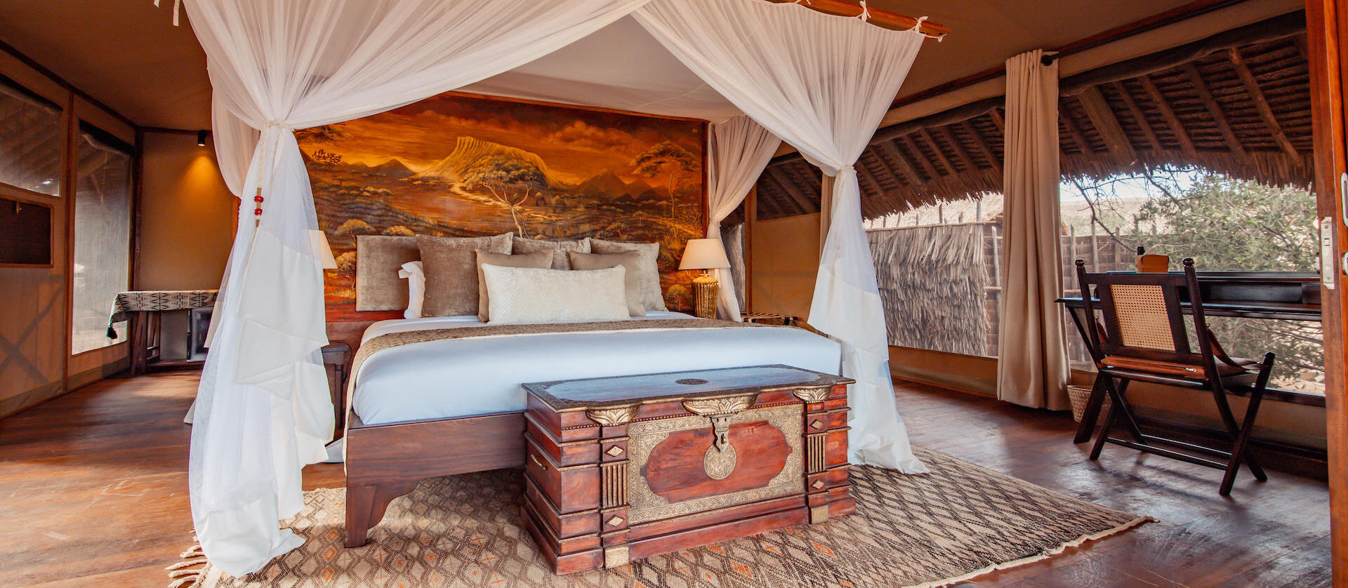 To dwanaście luksusowych jednostek, które pozwolą Wam w pełni poddać się urokowi afrykańskiej rzeki Ewaso Nyiro. Każdy namiot został wyposażony w przestronne łóżko typu king-size, biurko do pracy oraz dużą garderobę. Waszym prywatnym azylem stanie się drewniany taras z wygodnymi sofami, z którego możecie obserwować majestatyczne krajobrazy. Wnętrza dopełniają prywatne łazienki oraz spersonalizowany serwis, dbający o każdy detal Waszego pobytu.
