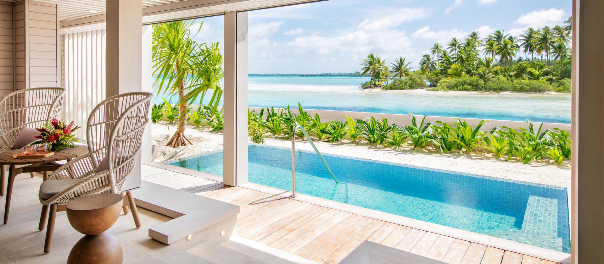 - Beach Suite - Pool: 89 mkw. powierzchni, jedno łóżko typu king, bezpośredni dostęp do laguny i plaży, prywatny taras oraz basen typu plunge, widok na lagunę