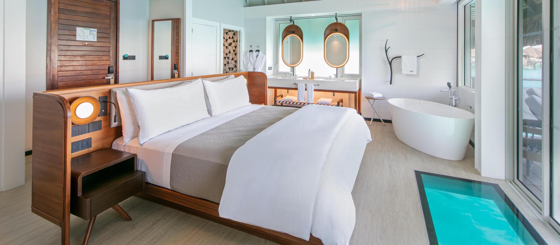 - Overwater Bungalow: 41 mkw. powierzchni, jedno łóżko typu king, bezpośredni dostęp do laguny, prywatny taras