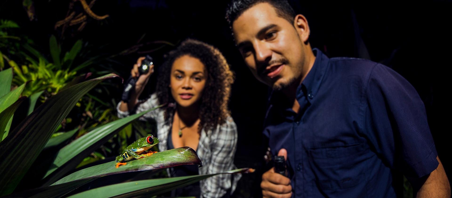 Ta przygoda rozpoczyna się od około 40-minutowego transferu do miejscowości La Tigra po zachodzie słońca. Tam wejdziecie na ścieżkę obok lasu z kilkoma naturalnymi zbiornikami wodnymi, które ułatwiają obserwację nocnych zwierząt, takich jak niektóre ptaki, ssaki, owady, płazy i nietoperze. Spacer odbywa się wokół luster wodnych, aż do sanktuarium żab, miejsca naturalnego rozmnażania wielu z tych płazów, takich jak żaba młotkowa i żaba rycząca, a także spektakularna żaba z czerwonymi oczami i piękna żaba szklana. Po zakończeniu wycieczki zjecie pyszną, typową kostarykańską kolację podziwiając nocną panoramę równiny San Carlos. Po kolacji nastąpi powrót do La Fortuna.