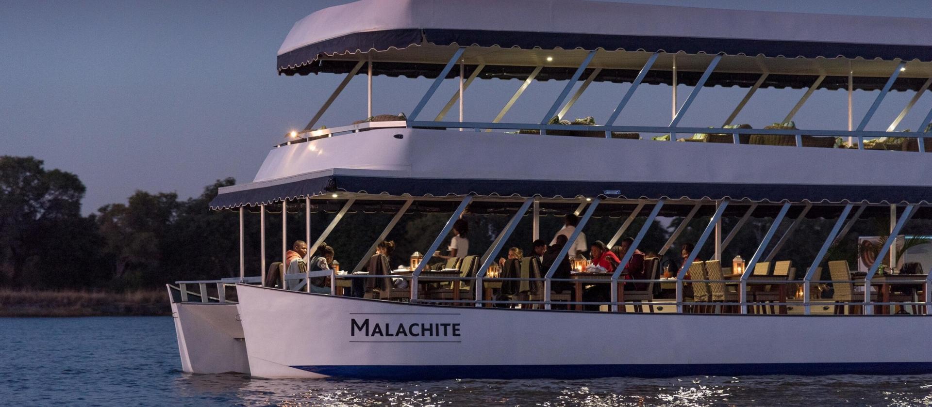 Luksusowy katamaran „Malachite” został zaprojektowany z myślą o komforcie i elegancji. Przestronny pokład, stylowe wnętrza i panoramiczne widoki sprawiają, że każda chwila spędzona na jego pokładzie staje się celebracją. Rejs rozpoczyna się o zmierzchu, gdy ciepłe, bursztynowe światło otula rzekę Zambezi, a niebo nad sawanną przybiera barwy ognia i fioletu. To idealny moment, by wznieść toast za piękno chwili lampką południowoafrykańskiego wina lub autorskim koktajlem serwowanym przez uśmiechniętą załogę.