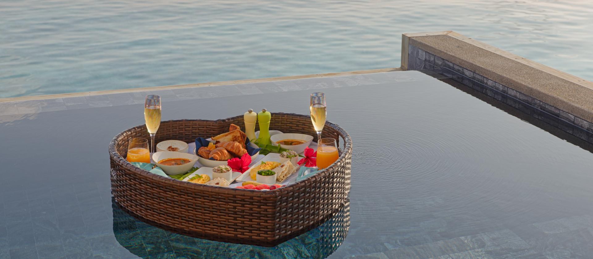 Dzień zaczyna się tutaj bez pośpiechu. Goście zanurzają się w ciepłej wodzie basenu, a obsługa dostarcza bogato udekorowaną tacę wypełnioną świeżymi owocami tropikalnymi, chrupiącymi wypiekami, jajkami przygotowanymi według życzenia, lokalnymi specjałami oraz aromatyczną kawą lub kieliszkiem musującego wina. Wszystko to podawane jest w otoczeniu turkusowej wody Oceanu Indyjskiego, z widokiem na bezkresny horyzont i białe plaże.