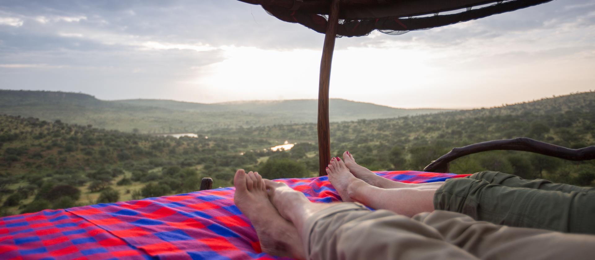 zapewniające komfortowy wypoczynek. Platformy zlokalizowane są w dwóch miejscach – pośród skał, z widokiem na wodopój i nad rzeką. Noc spędzona pod